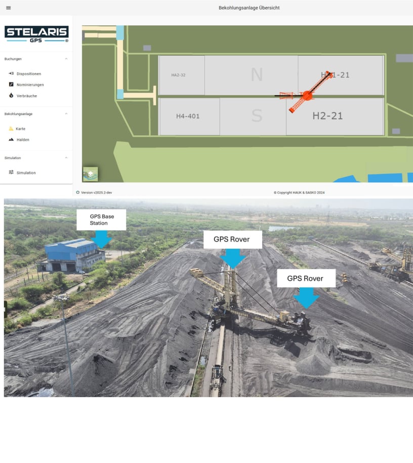 Unser System bietet eine Echtzeitüberwachung der Position von Fördergeräten wie Absetzern, Portalkratzern oder Schaufelradbaggern. Durch die kontinuierliche GPS-Ortung wird die exakte Lage dieser Geräte erfasst und sowohl in einer zweidimensionalen als auch in einer realitätsnahen dreidimensionalen Darstellung innerhalb eines SCADA-Systems visualisiert. Diese Visualisierung zeigt die Position der Geräte stets im Kontext der Haldenbereiche und einzelner Halden, was eine verbesserte räumliche Orientierung und Prozesskontrolle ermöglicht.